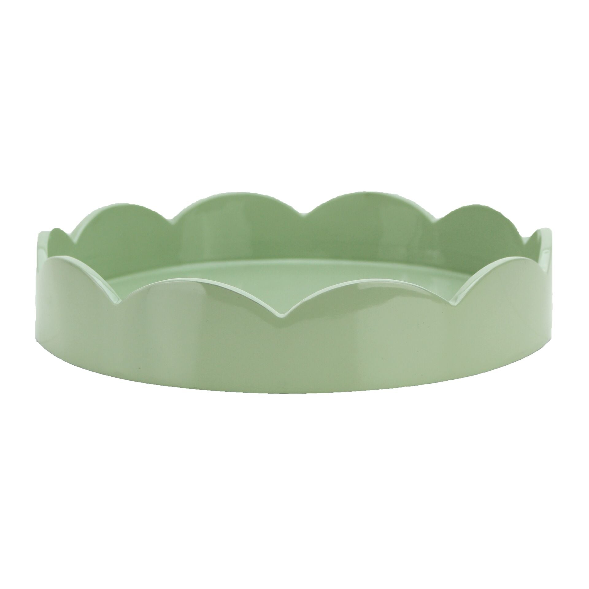 Güzel bir adaçayı yeşili yuvarlak deniz tarağı küçük tepsi, her kat arasında elle cilalanmış, 20 kat parlak lake ile kaplanmıştır. Taban siyah saten boyalıdır ve logomuzla kabartılmıştır. Güzel hediye kutulu. Boyut: 8,5 x 8,5 inç Yumuşak nemli bir bezle temizleyin.