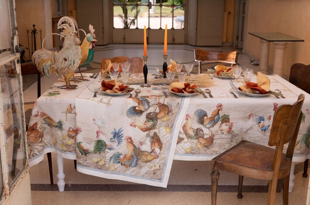 Doğal keten kumaş üzerine basılan bu zarif tasarım, doğaya ve kırsal yaşama duyulan sevgiyi sofistike bir şekilde yansıtır. ROOSTER masa örtüsü, hem günlük sofralarda hem de özel buluşmalarda sıcak ve rustik bir atmosfer yaratmak için ideal bir seçimdir.