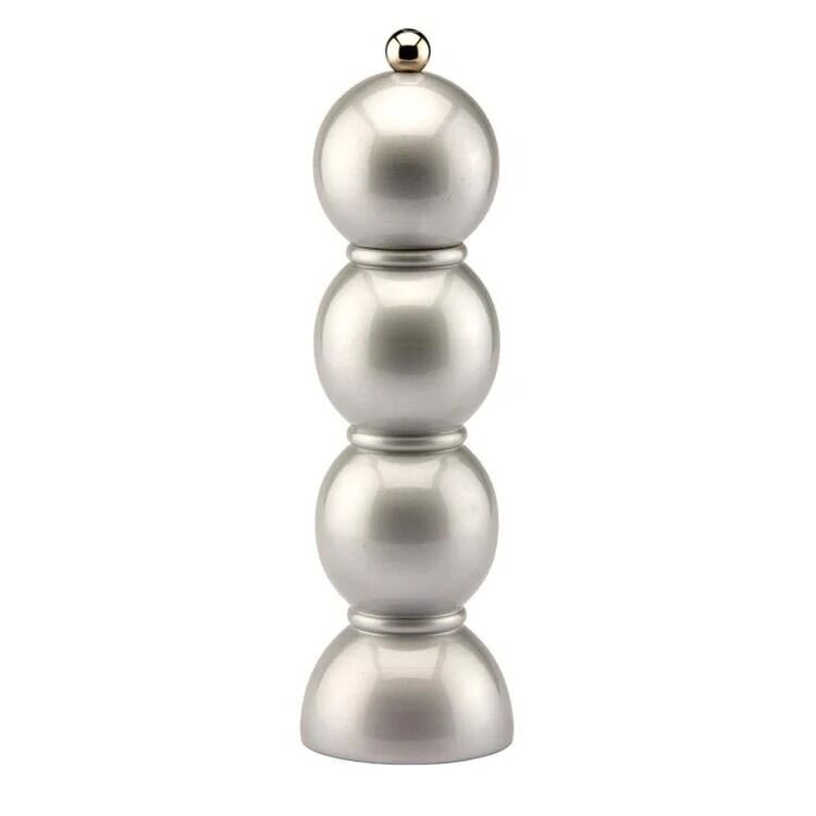 Addison Ross’a özel tasarlanan bu gümüş lake kaplı makara biçimli değirmen, sofralara modern bir ışıltı ve zarif bir dokunuş katıyor. Hem S hem de P harfli paslanmaz çelik vidalı düğmeyle birlikte sunulduğu için, ürünü ister tuz ister biber değirmeni olarak kullanabilirsiniz.