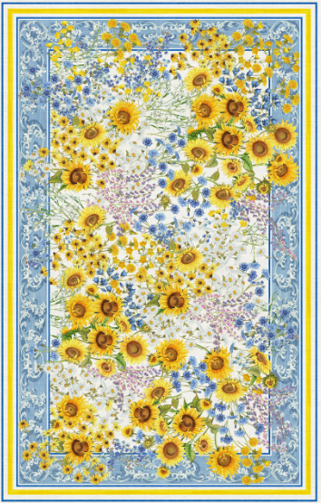 SUNGARDEN masa örtüsü, yaz bahçelerinin canlılığını ve güneşin sıcak enerjisini sofralarınıza taşır. Parlak ayçiçekleri, zarif kır çiçekleri ve yumuşak mavi tonların uyumu ile tasarlanan bu özel desen, doğanın neşeli ve ferah atmosferini yansıtır.