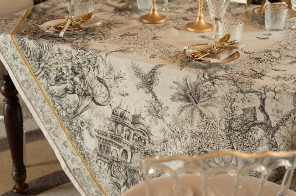 Ünlü sanatçı Thierry’nin sanatsal yorumuyla hazırlanan detaylı desenler; tropik doğa, gizemli kalıntılar ve keşif sahneleriyle zenginleşerek adeta bir macera haritasını andıran kompozisyon oluşturur. İnce çizim detayları ve doğal tonlar, masa örtüsüne sofistike ve sanatsal bir karakter kazandırır.